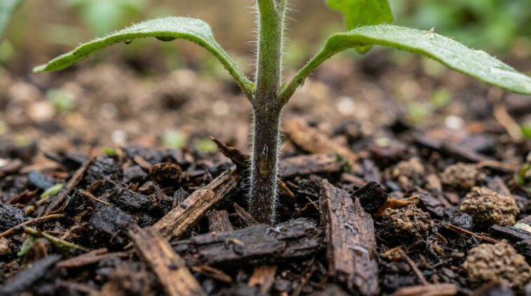 La grande révélation pour garantir un feuillage exubérant est d’aménager un écartement vital. Lors de la plantation au printemps, il faut impérativement laisser au moins 1 cm d’espace dégagé entre le collet de la tomate et la surface humide (que ce soit la terre mouillée ou la couche de paillage). Si la terre gadoueuse, ou les débris végétaux gorgés de pluie, viennent s’agglutiner directement contre ce petit point sensible, l’excès d’eau entraînera instantanément des pourritures. La tige s’amincit, noircit et le plant dépérit en quelques jours seulement.