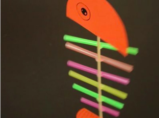 4) Coupez les pailles pour créer les arêtes du poisson. Disposez-les sur la baguette par ordre de taille croissant : les plus longues vers la tête et la taille diminue jusqu’à la queue. N’oubliez pas d’alterner les couleurs !