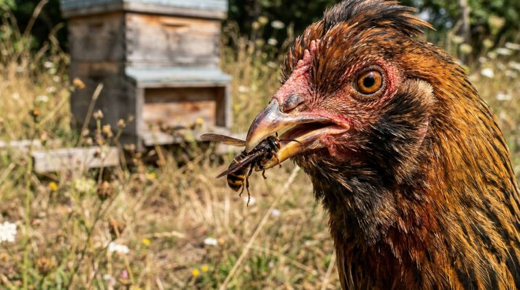 Le frelon asiatique est le fléau absolu des abeilles mellifères. Il se poste en vol stationnaire devant les ruches pour massacrer les éclaireuses épuisées. Placer des poules à proximité immédiate des colonies permet de perturber cette technique de siège. Les abeilles, filant droit et haut, ne sont pas inquiétées par ces gardiennes terrestres, tandis que les frelons lourds qui descendent vers le sol finiront inévitablement picorés. Une cohabitation étonnante qui offre un répit vital aux travailleuses du nectar.