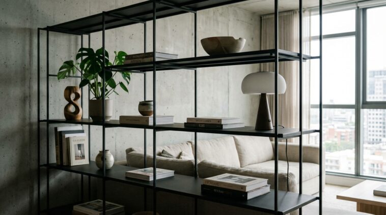 Les étagères murales et les bibliothèques sur pied ont longtemps été dominées par une esthétique particulièrement rude. L’omniprésence du métal noir filaire s’était imposée comme la norme dans la maison depuis 2016, trônant fièrement dans chaque coin bureau ou salon. Ce fameux style industriel, avec ses structures rappelant les usines réhabilitées et ses meubles souvent customisés pour imiter de grands casiers métalliques, semblait intemporel. Toutefois, cette abondance d’acier sombre absorbait la lumière naturelle au lieu de la refléter, créant au quotidien une ambiance parfois trop austère et figée.