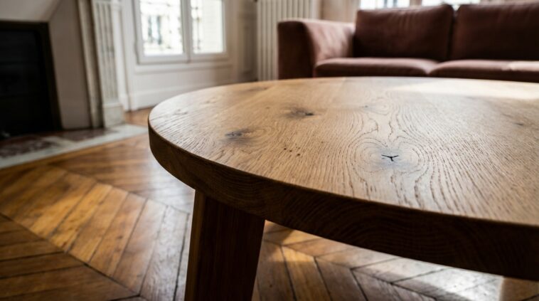 Au-delà de la forme, c’est la matière qui donne le ton d’un intérieur intemporel. Les matériaux synthétiques froids laissent place ici à la chaleur du bois. Ce modèle met à l’honneur le chêne polonais, reconnu pour sa noblesse et ses veinures caractéristiques qui accrochent la lumière naturelle. La teinte naturelle de cette table est un véritable atout : elle ne s’impose pas, elle illumine. Contrairement aux bois foncés qui peuvent assombrir une pièce, cette finition claire s’accorde aussi bien avec un tapis berbère qu’avec un sol en béton ciré ou un parquet ancien.