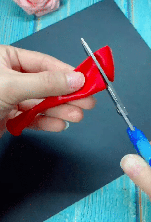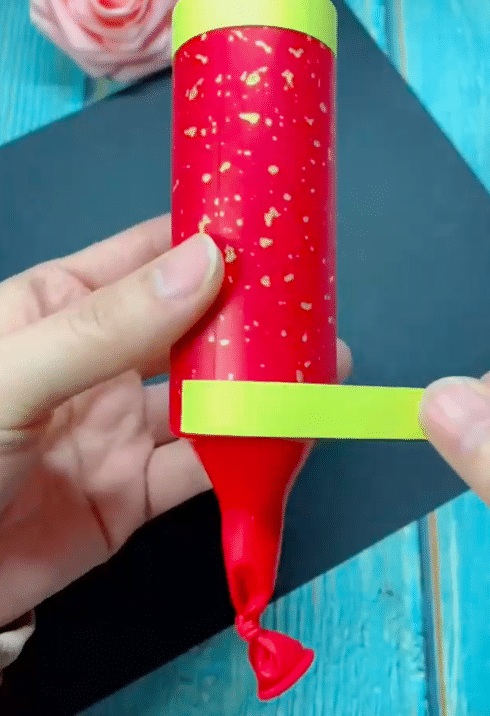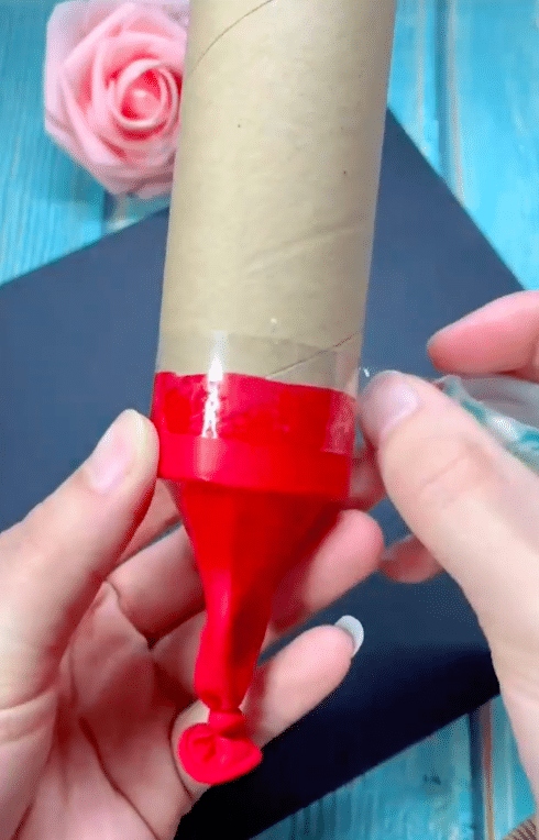 1. Prenez votre rouleau de papier toilette, le ballon et le scotch. Dans un premier temps, coupez la partie haute du ballon, faites un nœud pour le rendre étanche et enfin faites-le passer autour du rouleau comme sur la photo ci-dessous. Fixez le ballon fermement avec du scotch.