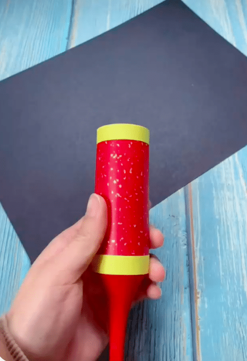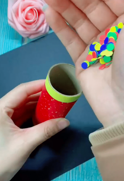 2. Découpez un morceau de papier cadeau de la dimension du rouleau de papier toilette et collez le dessus. Ensuite, découpez deux bandes dans une autre couleur de papier cadeau et collez-les aux deux extrémités du rouleau. Cela vous permettra d’obtenir un canon à confettis encore plus réaliste !