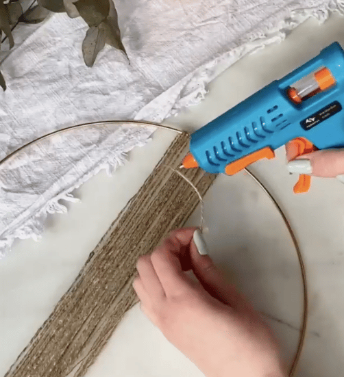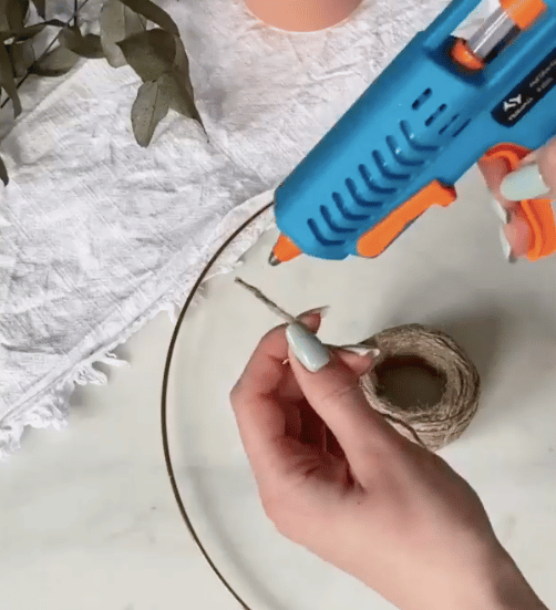 1. Commencez par prendre votre anneau en métal ainsi que votre rouleau de ficelle. Après avoir fait chauffer votre pistolet à colle, mettez un point de colle à l’extrémité de la ficelle et placez-la directement sur l’anneau en la maintenant pendant quelques secondes le temps que la colle fige. Si vous n’avez pas de pistolet à colle, vous pouvez tout simplement faire un nœud !