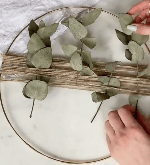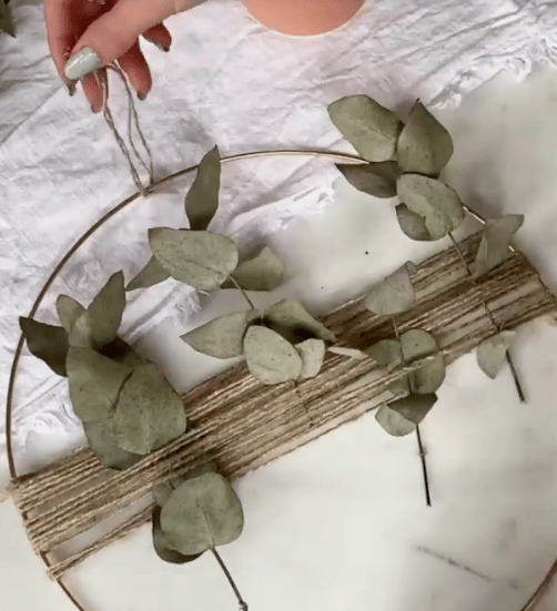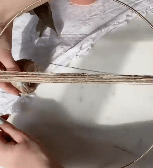 2. Tout en maintenant avec vos doigts le bout de ficelle collé, commencez à enrouler la ficelle autour de l’anneau pour former une sorte de bande. Faites autant de tours que vous le souhaitez. À savoir : plus vous ferez de tours de ficelle, plus vous obtiendrez une bande épaisse capable de maintenir plusieurs fleurs. Si vous faites le choix d’en faire peu, vous obtiendrez une composition plus épurée, mais il faudra être plus vigilant pour faire tenir vos plantes séchées.