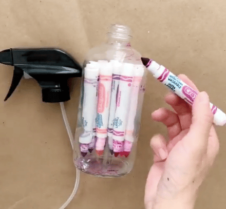 2. Maintenant que tous vos feutres sont classés par couleur, munissez-vous d’un flacon, retirez les bouchons du premier groupe de feutres que vous avez fait et placez-les pointes vers le bas à l’intérieur du flacon.