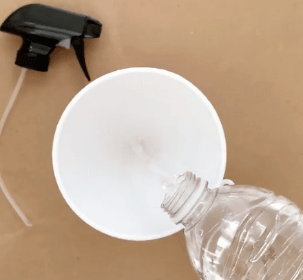3. Ajoutez de l’eau environ aux trois quarts du flacon vaporisateur. Si vous en avez un sous la main, sachez qu’un entonnoir vous facilitera grandement la tâche. Refermez ensuite avec la tête du vaporisateur.