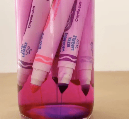 4. Patientez quelques instants que les couleurs commencent à s’écouler des feutres. En réalité, cela se produit assez rapidement et en quelques minutes vous devriez voir votre eau commencer à prendre une jolie teinte ! Secouez de temps en temps pour uniformiser la couleur. Après une heure, toute l’encre de vos feutres devrait être sortie et vous devriez obtenir la couleur finale.