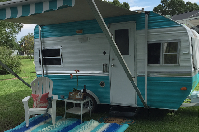 L’extérieur a aussi complètement changé ! Les codes couleur sont les mêmes avec une association bleu clair et blanc. Qui aurait cru que cette caravane date de 1984 ?