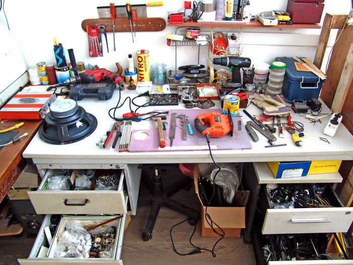 Comme vous pouvez le constater, son plan de travail possède une dizaine d’outils nécessaires à la transformation de palettes en bois ordinaires