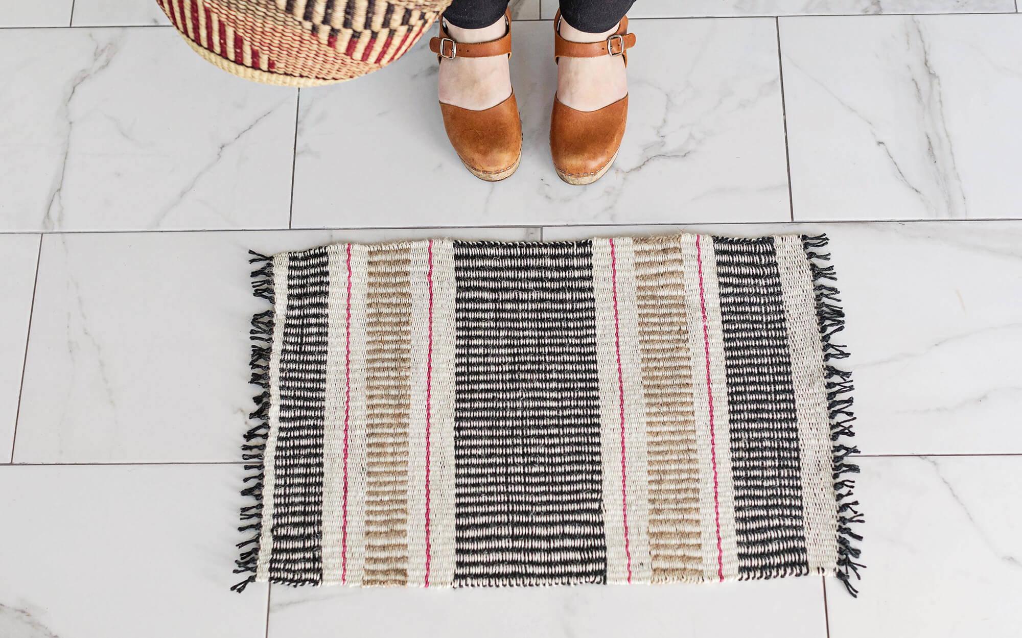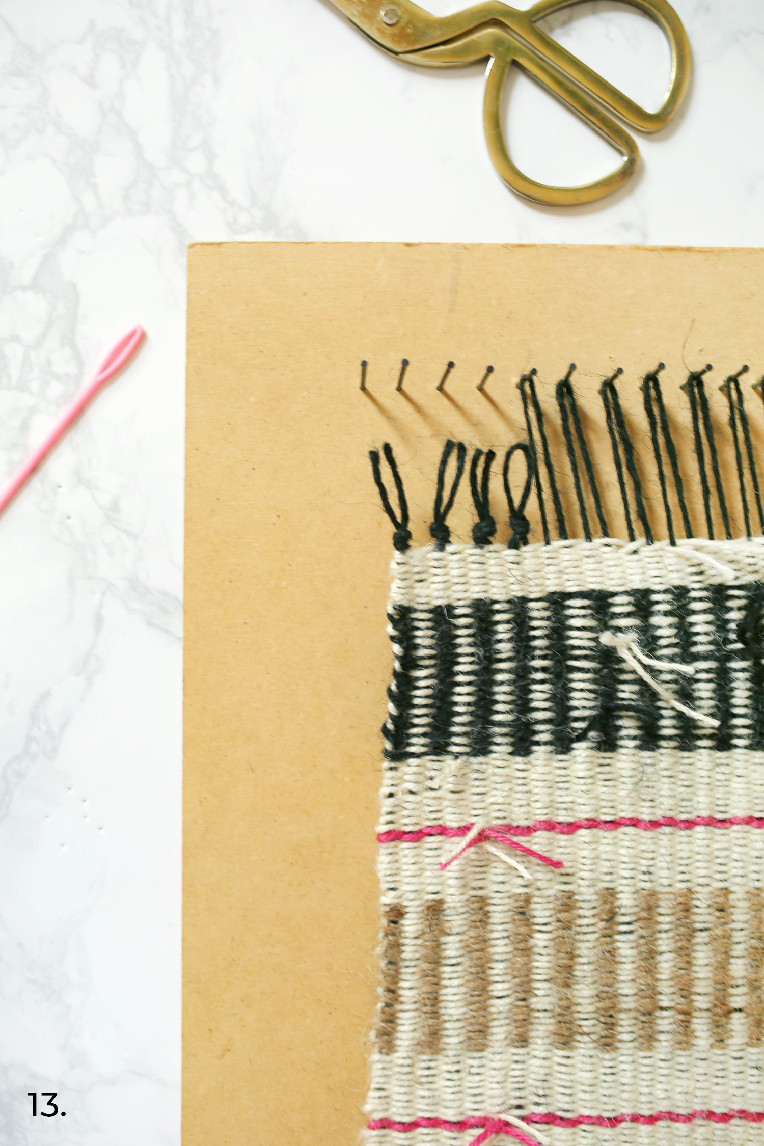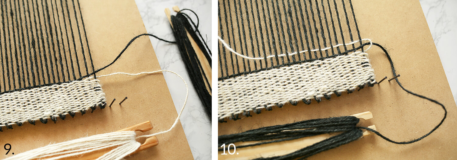 6) Continuez à tisser en allant de l’avant vers l’arrière jusqu’à ce que vous n’ayez plus de fil de jute. Afin d’obtenir des bords propres, finissez votre fil sur une nouvelle rangée avec une boucle.
