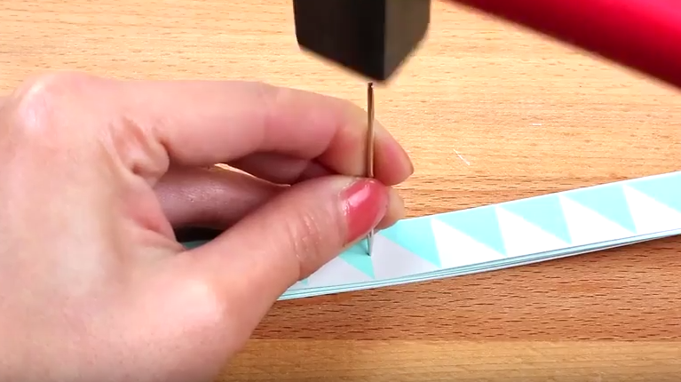 2) Perforez les lamelles ensemble à chaque extrémité ainsi qu’au centre à l’aide d’un marteau et d’une aiguille.