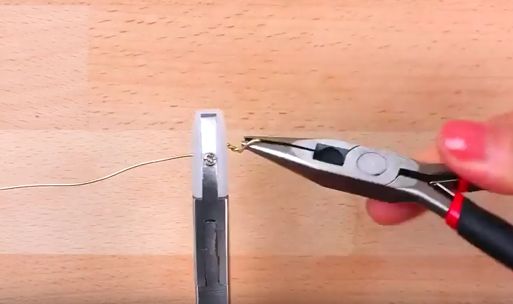 3) Pince en main, réalisez une boucle avec le fil de fer doré. Enfilez une perle au bout de la boucle.