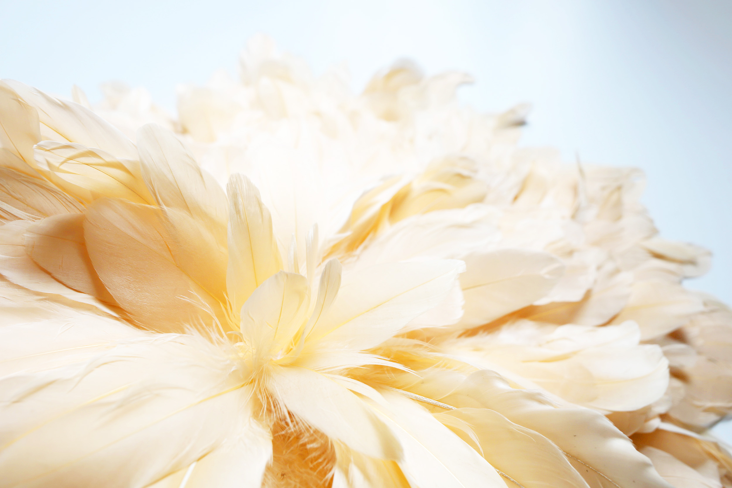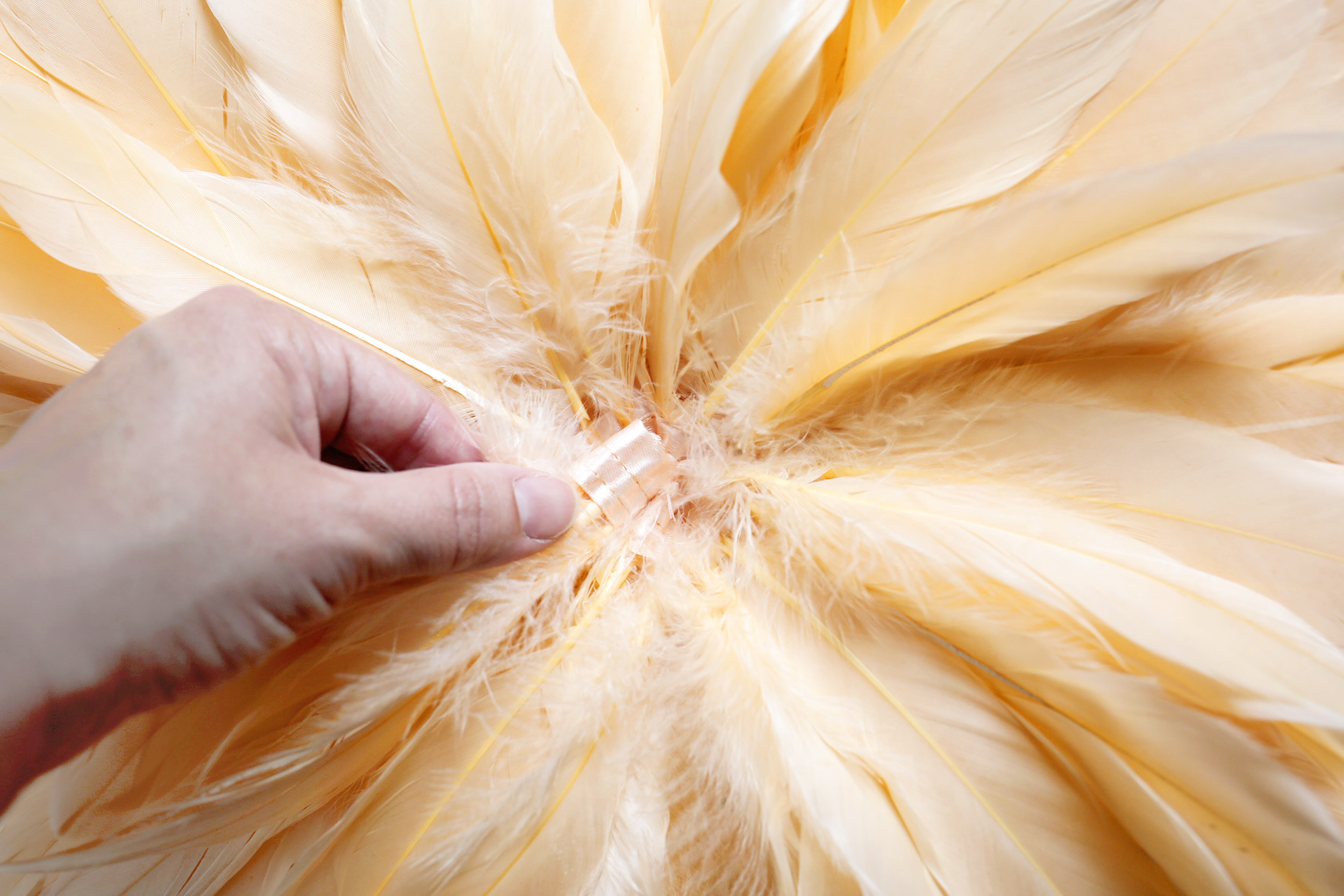 7) A présent, découpez une dizaine de pointes de plumes d’environ 4-5 centimètres et collez-les également en cercle.