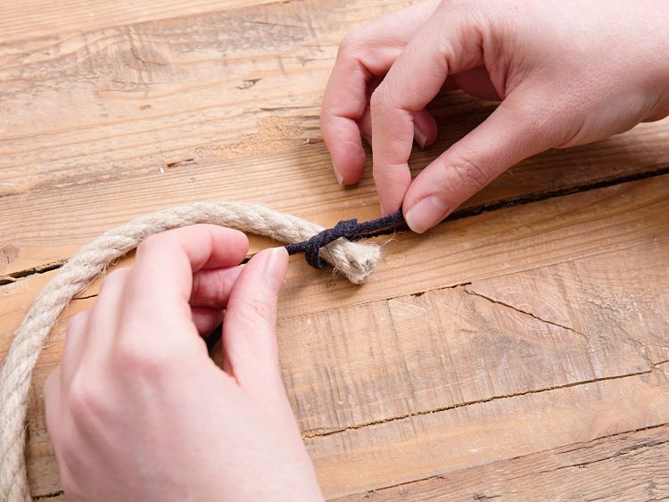 2) Réalisez un nœud bien serré avec le fil à une extrémité de la corde.