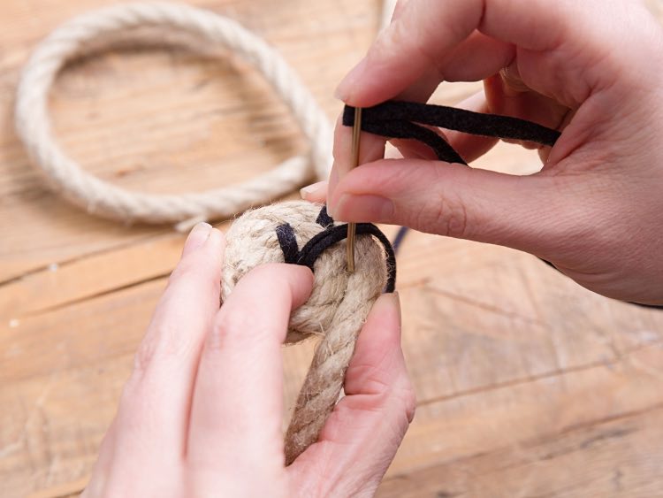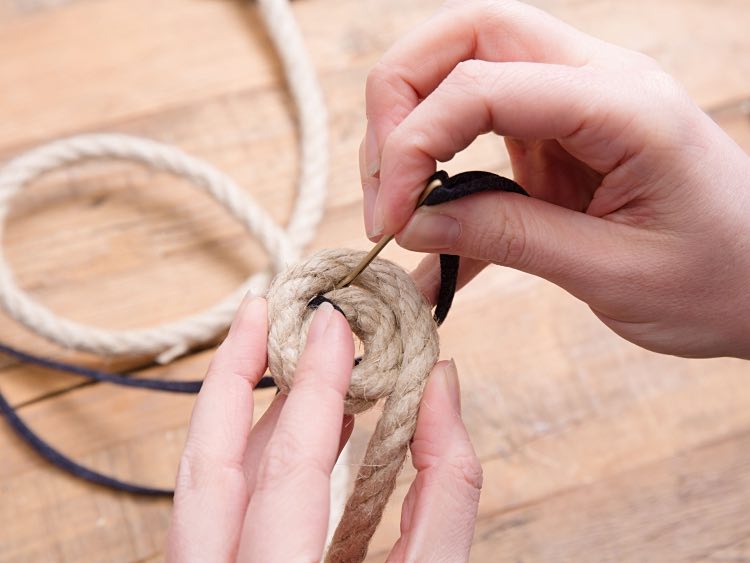 1) Commencez par prendre votre corde et le fil choisi pour ce tissage.