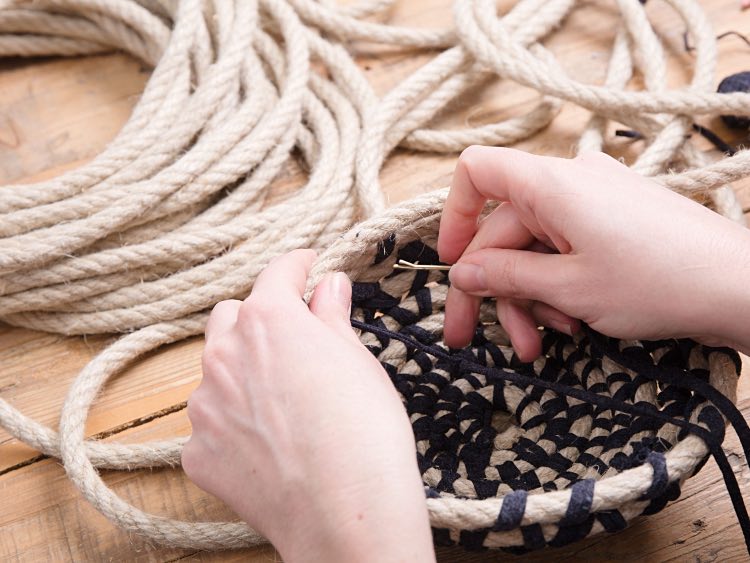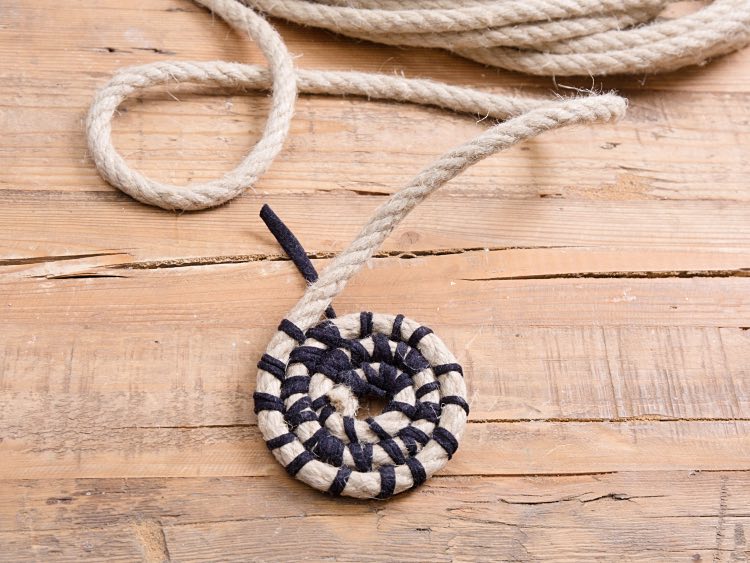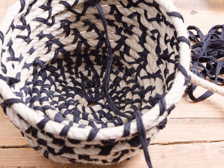 6) Tournez des bouts de cette corde sur elle-même et continuez à nouer le fil pour la maintenir plate et résistante. Et ce, jusqu’à ce que vous jugiez que la base est assez grande. Pour info, 7 tours ont été nécessaires pour réaliser le fond de la corbeille présentée dans ce tutoriel.