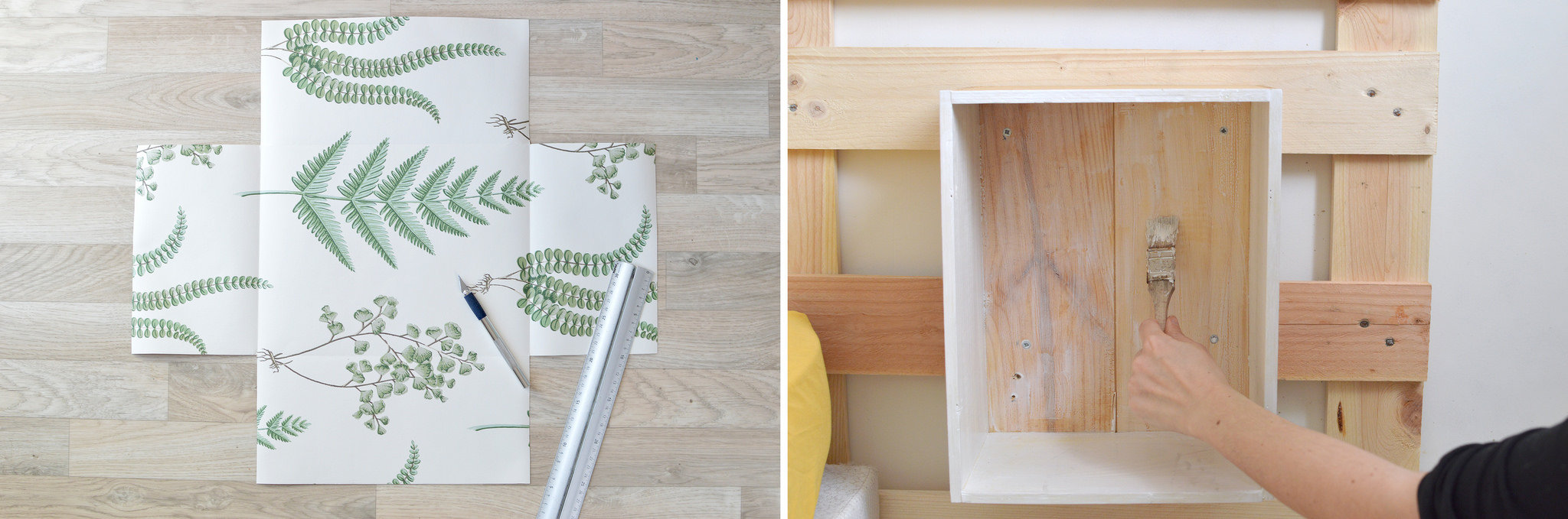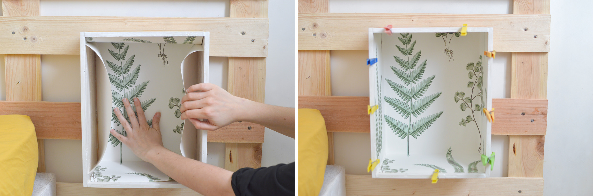 4) Prenez les mesures de vos caisses à vin et appliquez le papier peint où vous le désirez. Un peu de colle, un cutter pour découper le papier peint selon les mesures adéquates et le tour est joué ! Si vous le positionnez sur les bords, vous pouvez vous aider de pinces à linge pour le maintenir, le temps que la colle sèche.