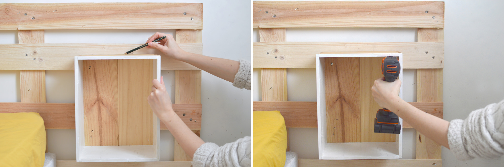 2) Une fois que tout est bien sec, prenez quelques cales en bois et utilisez-les pour fixer les deux palettes entre elles. Vous pouvez également les laisser indépendantes mais nous pensons que la tête de lit gagnera en stabilité de cette manière.