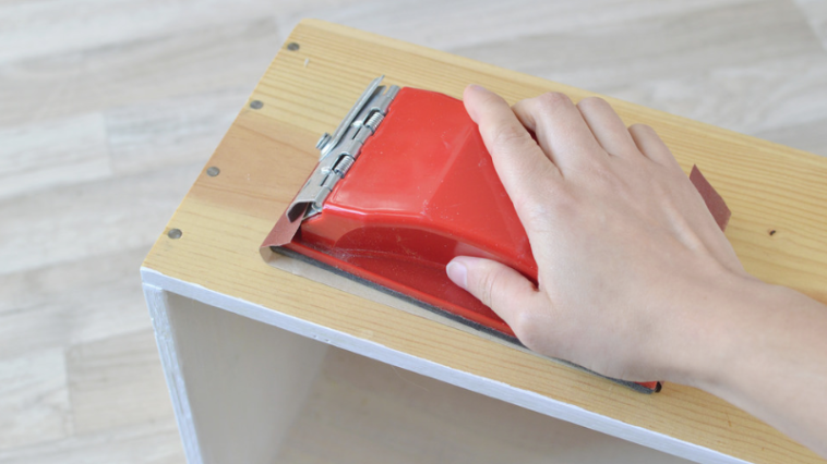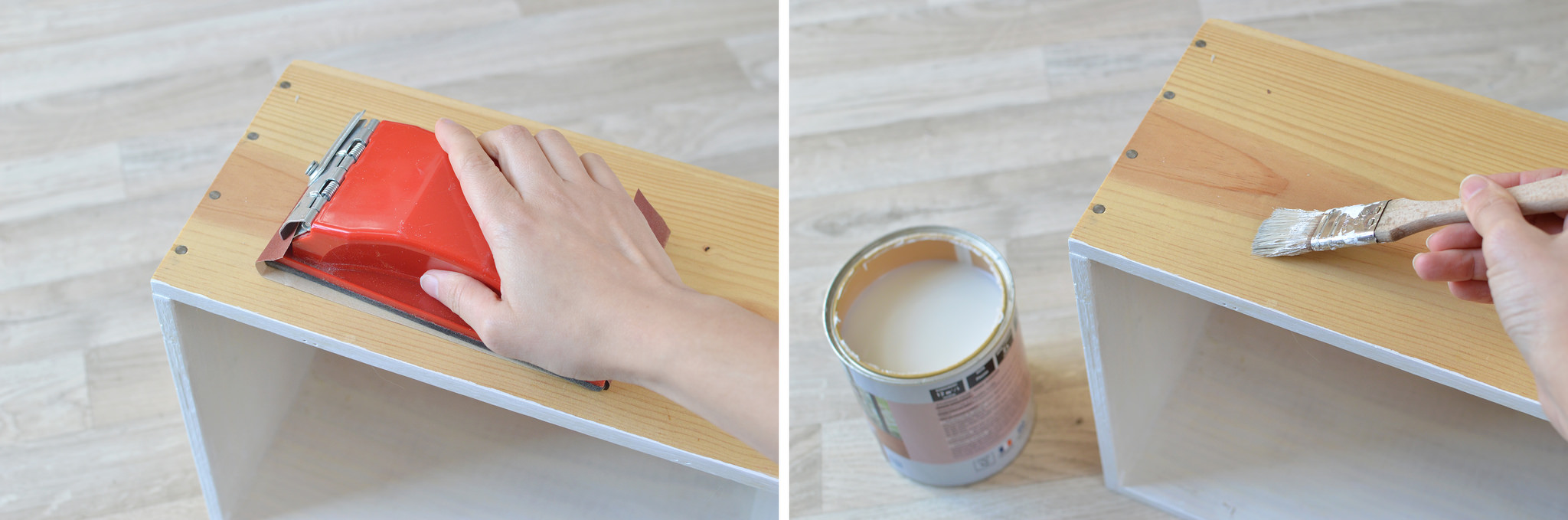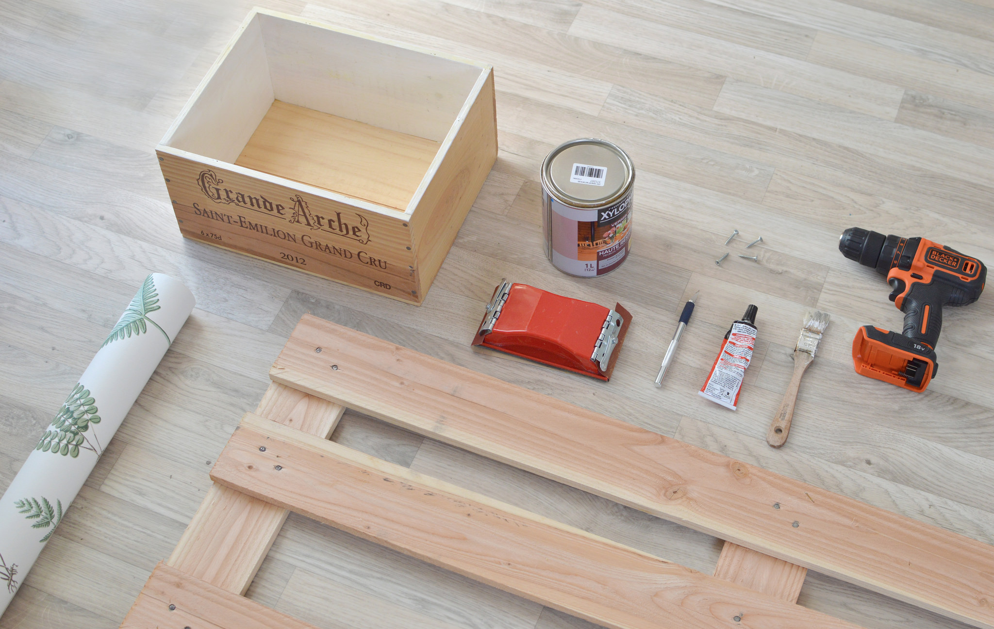 1) Tout d’abord, poncez les caisses et les palettes afin d’éliminer les échardes. Ensuite, vernissez l’ensemble en laissant sécher entre les deux couches.