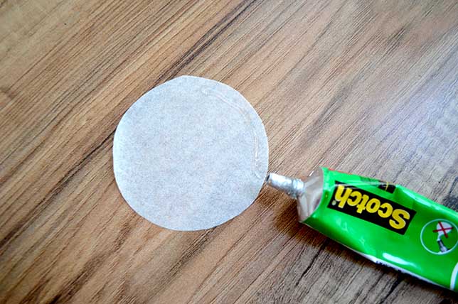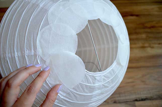 2) Maintenant, appliquez de la colle en haut d’un disque et posez-le sur la lanterne en commençant par le bas de la lanterne (obligatoirement). Attendez bien que la colle sèche avant de passer à un autre disque.