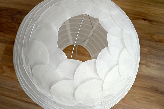 5) Poursuivez jusqu’à ce que la lanterne soit totalement recouverte. Lorsque vous arriverez en haut, pliez le haut des disques afin que le bord soit net.