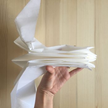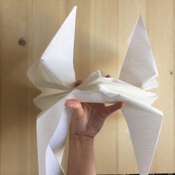9. Il faut désormais fermer quelque peu l’une des ouvertures en resserrant le haut de la boule d’origami. Appliquez ensuite un point de colle pour la maintenir fermée.
