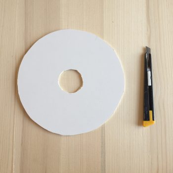 8. A présent, on va réaliser le support en carton. Découpez un cercle de 20 centimètres dans le carton prévu à cet effet. Et, découpez un autre petit cercle en son centre, de 4 centimètres.