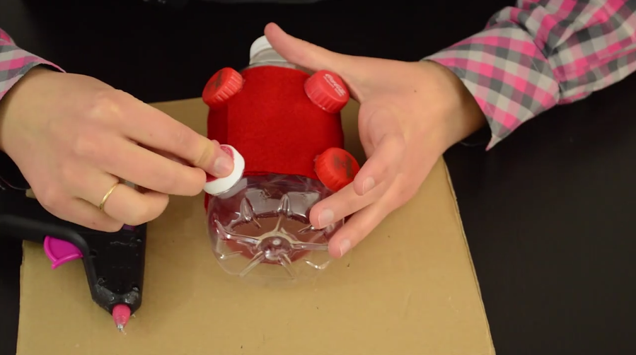 4/Dans la feuille de mousse, découpez deux oreilles de cochon. Coupez également un morceau de mousse et collez-le autour de la bouteille.