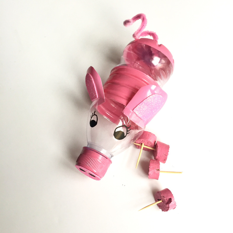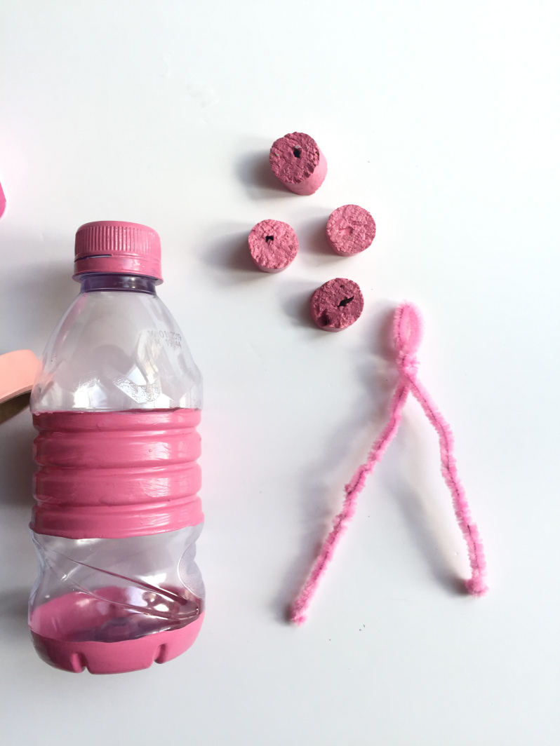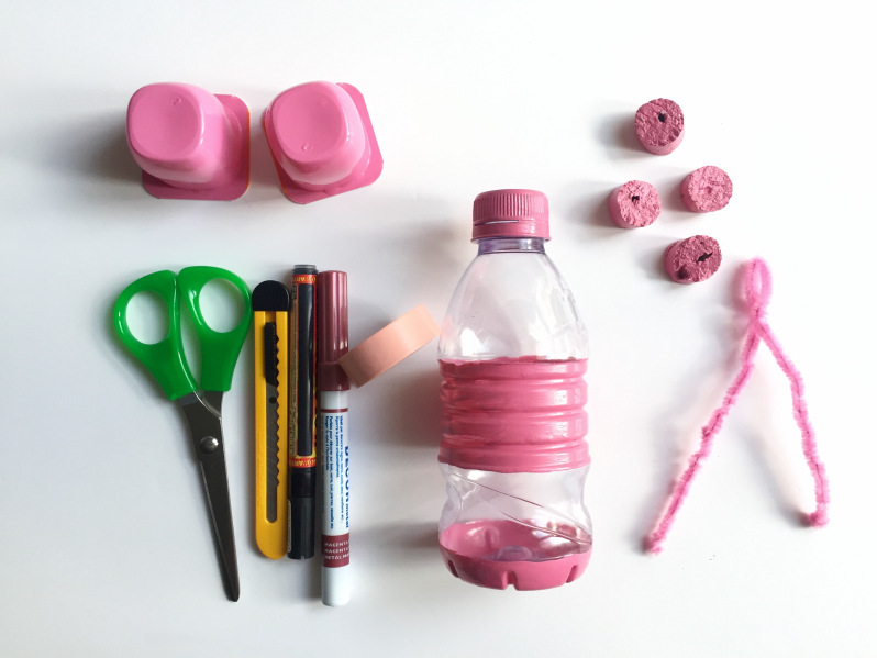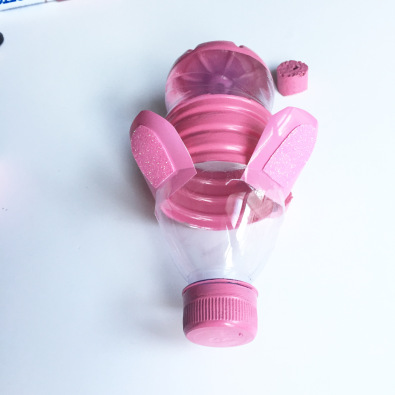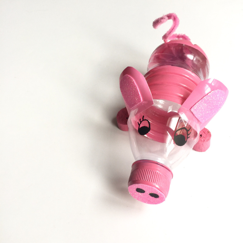 2) Attaquez-vous à la peinture. Peignez en rose plusieurs parties de la bouteille en plastique (comme sur la photo) afin de laisser un peu de transparence pour suivre la progression de son butin.