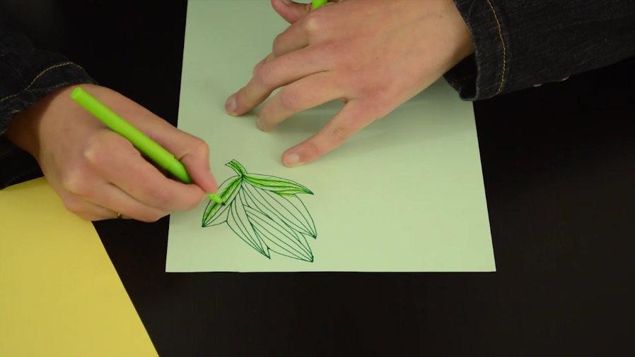 1/Sur le papier vert, dessinez une grande feuille au feutre vert. N’hésitez pas à ajouter des détails avec une autre nuance de vert et découpez-le.