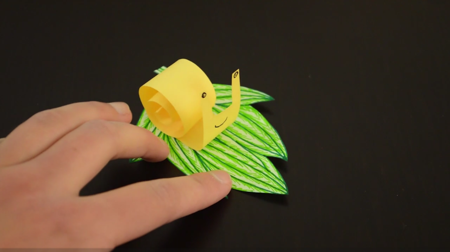 4/Collez l’escargot sur la feuille et n’oubliez pas de lui dessiner des yeux sur les tentacules, ainsi qu’une bouche.