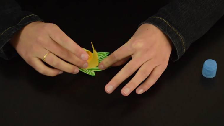 2/Découpez un morceau de papier jaune sur sa largeur et enroulez-le sur lui-même, tout en laissant quelques centimètres intacts.