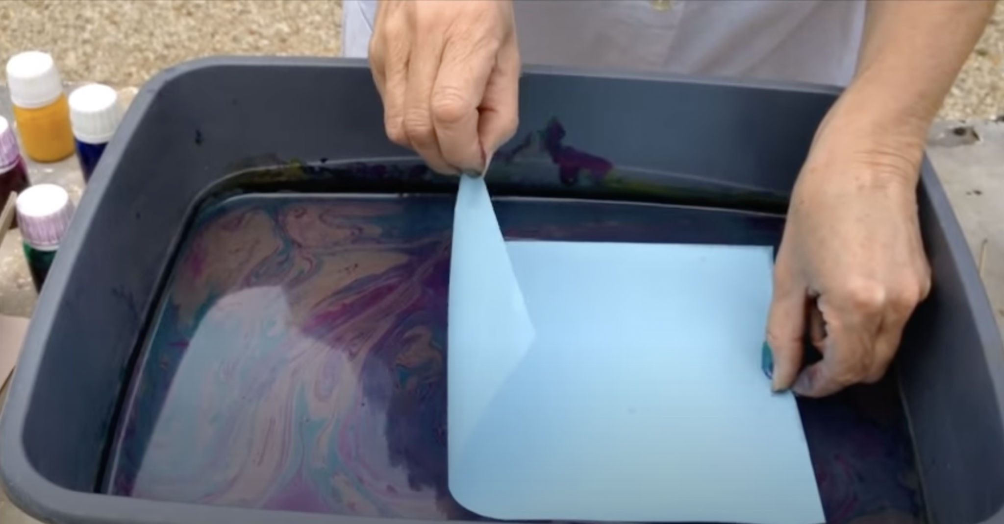 Tapotez légèrement sur toute la surface de votre feuille sans l’immerger afin de bien faire prendre le motif. Sortez votre feuille de l’eau afin d’admirer le résultat !