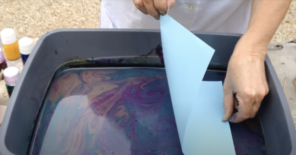 Nous arrivons à l’étape fatidique de l’application du motif sur le papier. Prenez votre feuille et déposez délicatement un côté à la surface de l’eau, puis déroulez doucement votre feuille pour éviter les bulles.