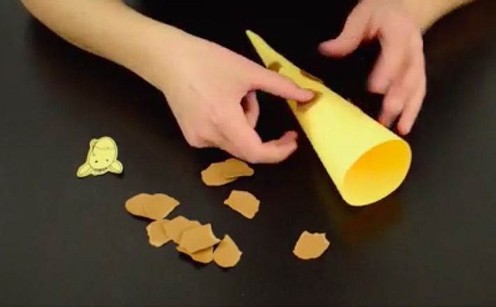 4/Prenez la feuille de papier marron et déchirez des petits morceaux. Collez-les au cône pour créer les motifs de votre girafe.