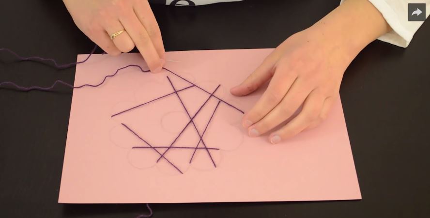 2/Enfilez du fil dans une aiguille et commencez à réaliser votre tissage en perçant un point de votre fleur au recto du papier. Allez à un autre point et percez cette fois-ci le verso du papier.
