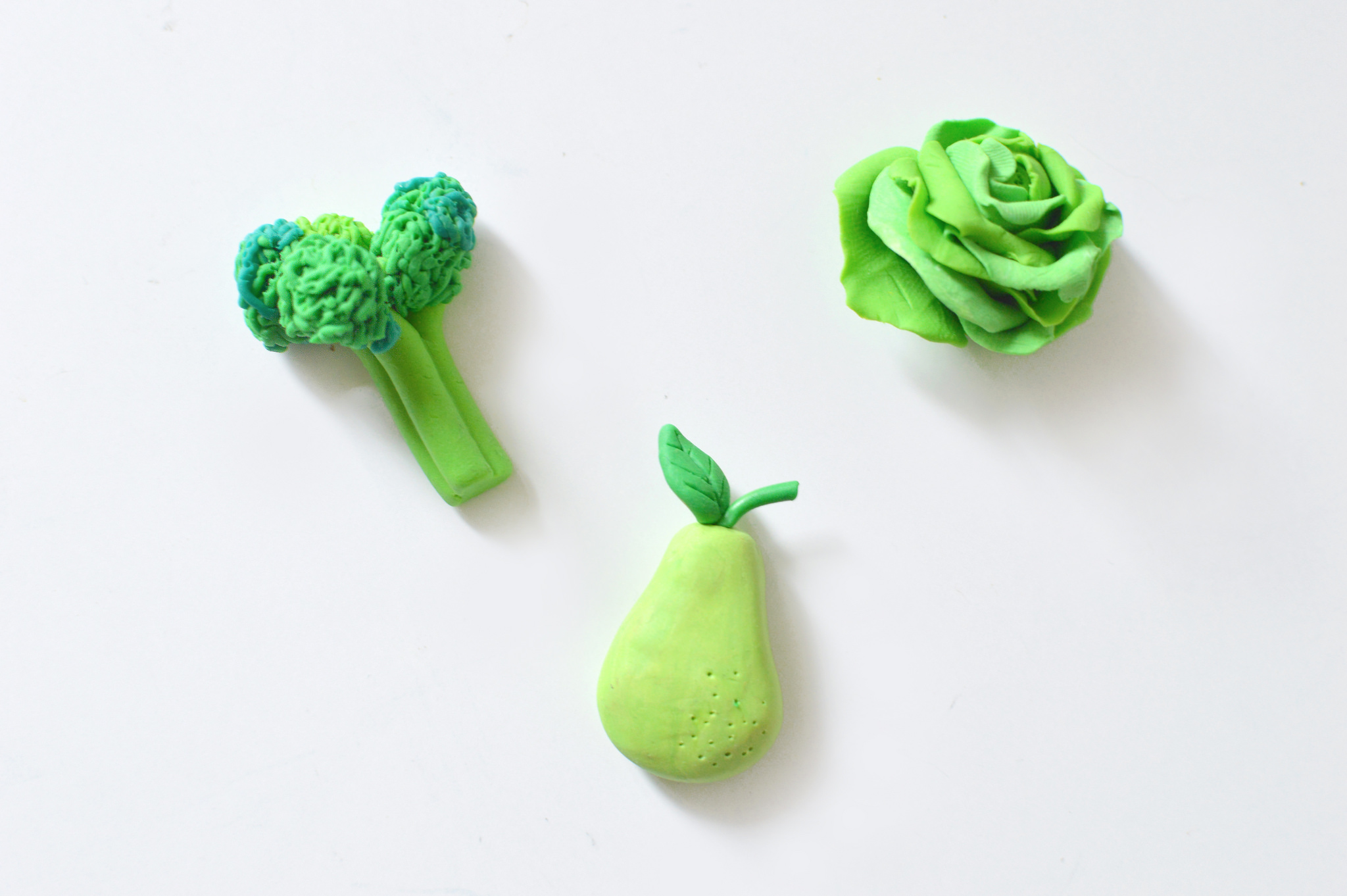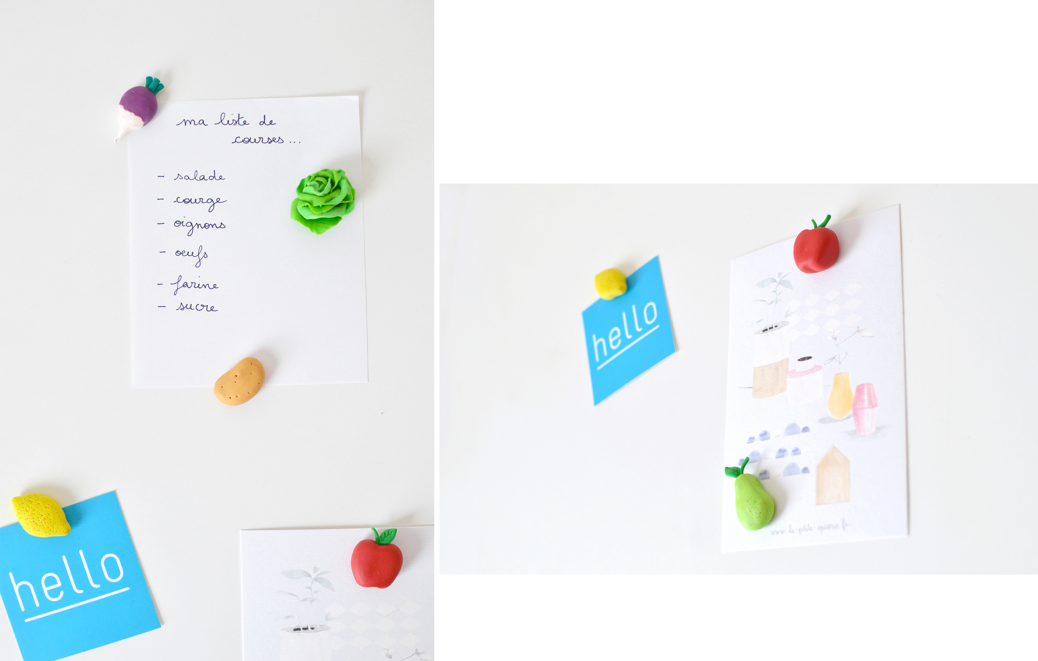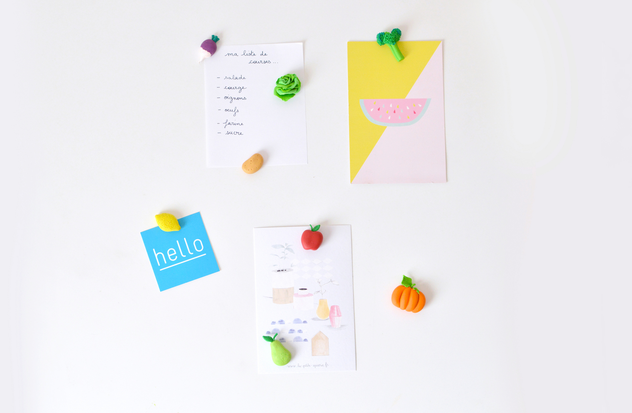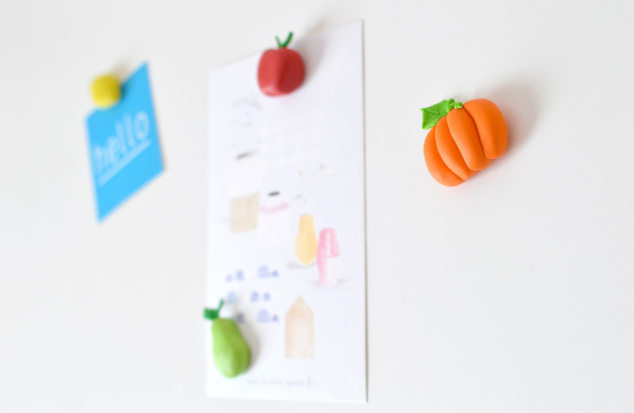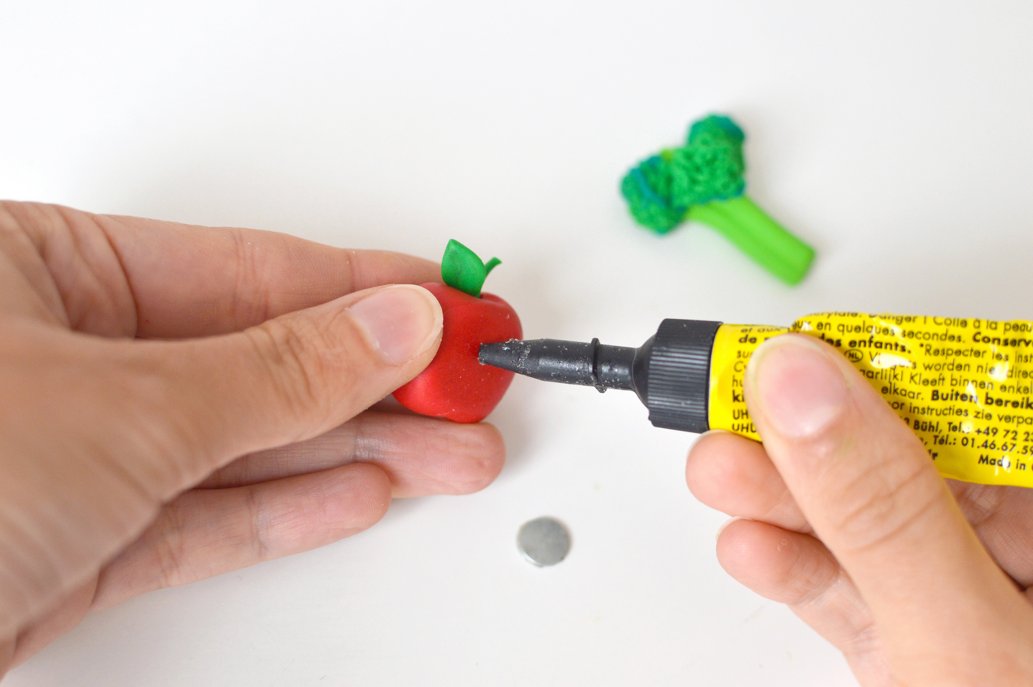 13. Une fois sortis du four, et refroidis, posez de la colle au verso des fruits et légumes et appliquez un aimant par dessus.