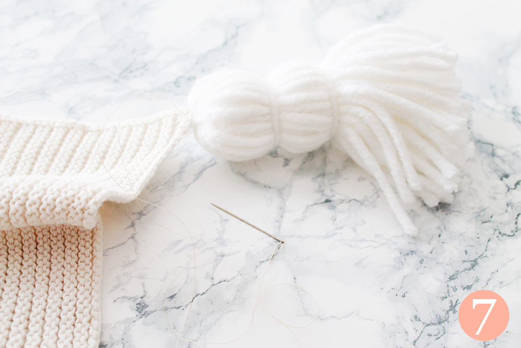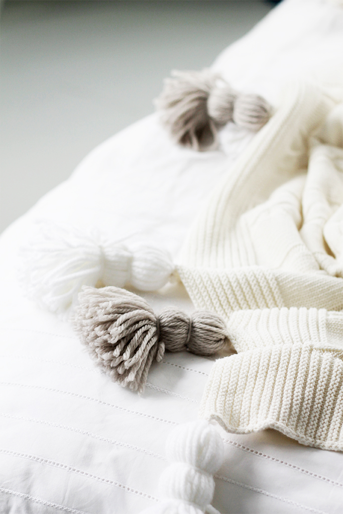 7) Pour finir, dispersez ce pompon, et la dizaine d’autres que vous allez faire, autour du plaid en les cousant.