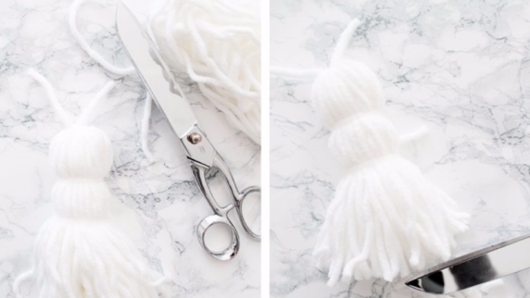 6) Toujours armé(e) de votre paire de ciseaux, égalisez les fils au pied du pompon.