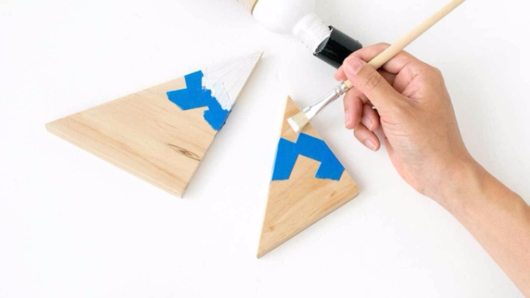 4) C’est le moment de vous occuper de vos futures montagnes. Prenez un morceau de bois, une scie ainsi qu’une boîte à onglets et coupez 2 carrés (un grand et un plus petit).