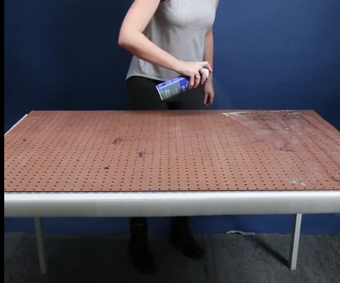 9) Retournez l’ensemble de sorte que la planche perforée se trouve sous la mousse, entre deux tables en hauteur.