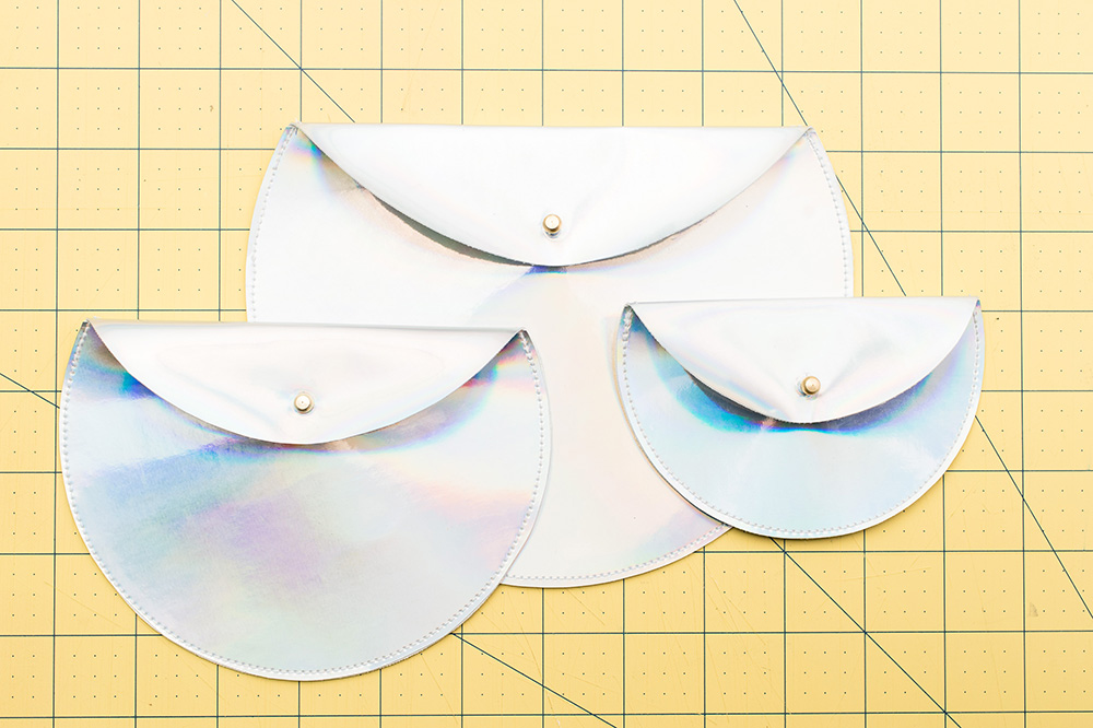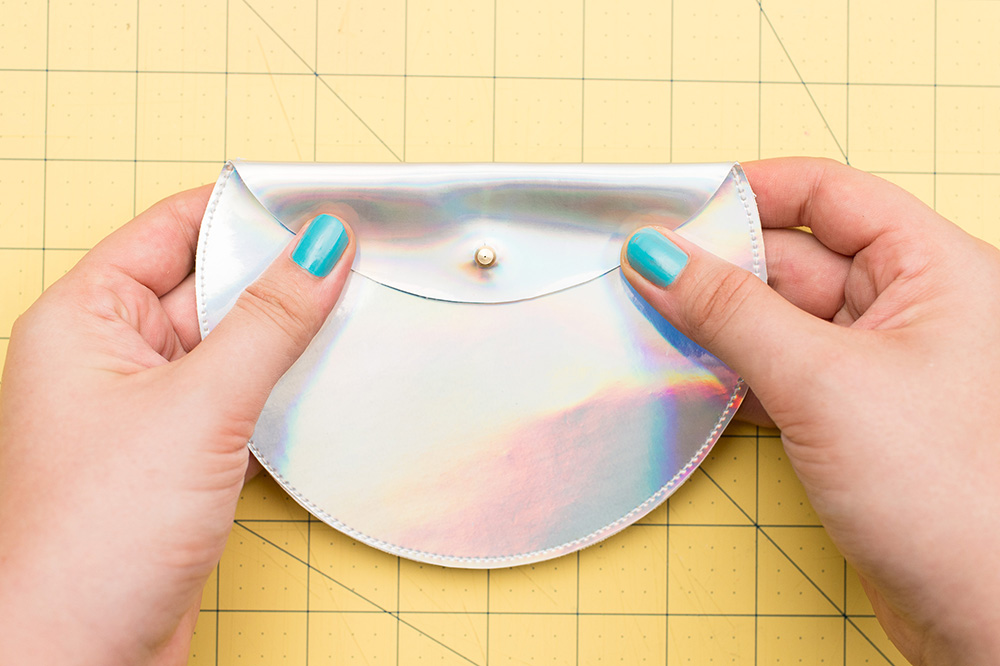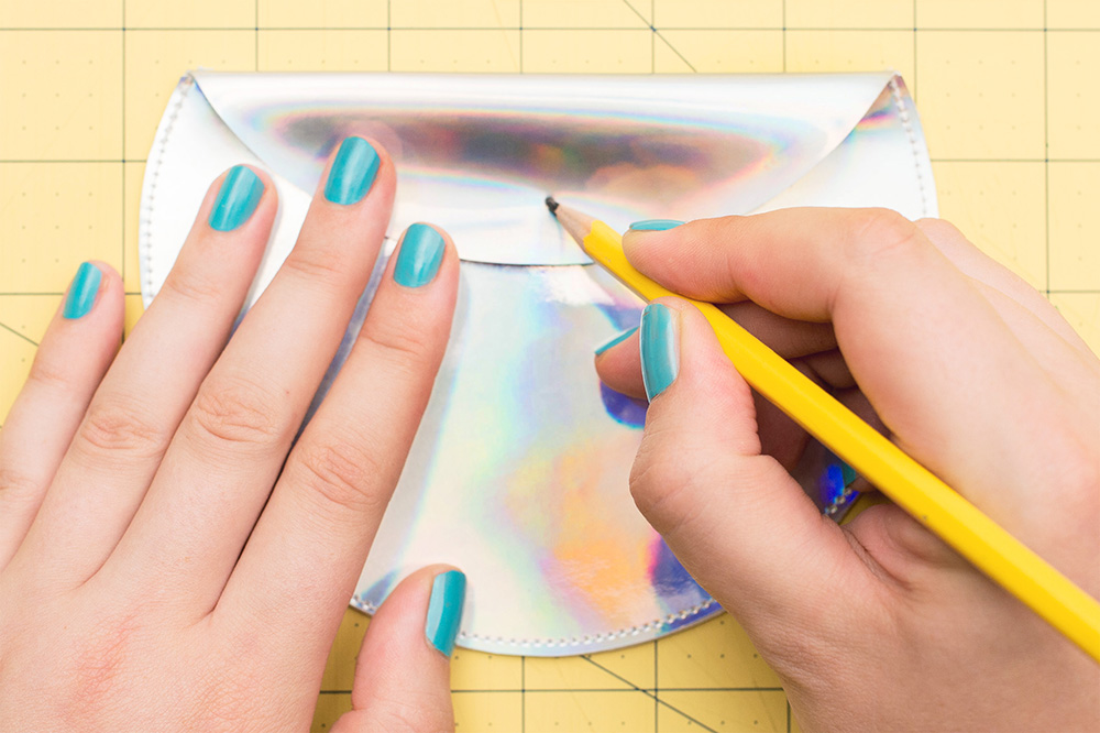 10. Maintenant, c’est le moment d’ajouter le rivet. Pour cela, pliez le rabat supérieur sur l’avant de la pochette et faites une marque à l’endroit où vous souhaitez le placer (assez fort pour que la deuxième couche soit également marquée).