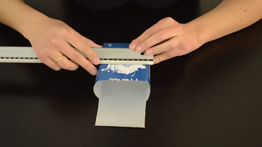 1/Tracez une ligne sur le recto de la brique ainsi que sur les deux côtés. Découpez au cutter. Une fois fait, découpez également le haut de la brique à l’aide des ciseaux. Voilà le résultat obtenu :