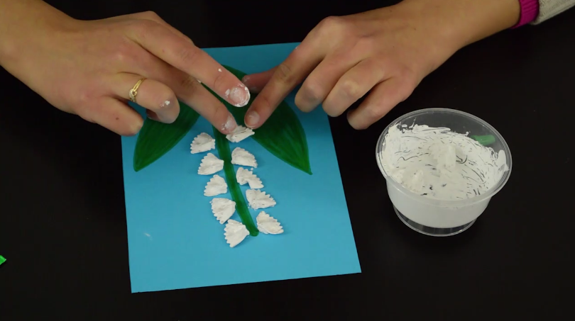 3/ Sur le papier coloré, dessinez au feutre vert une longue tige ainsi que les racines du muguet et coloriez-les.