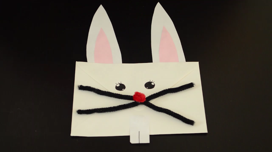 6/Collez ensuite les oreilles au dos de l’enveloppe. Retournez l’enveloppe et collez en bas le rectangle représentant les dents du lapin. Sur la fermeture, collez les deux cure-pipes afin de former la moustache et n’oubliez pas de coller par-dessus la boule rouge pour le nez.