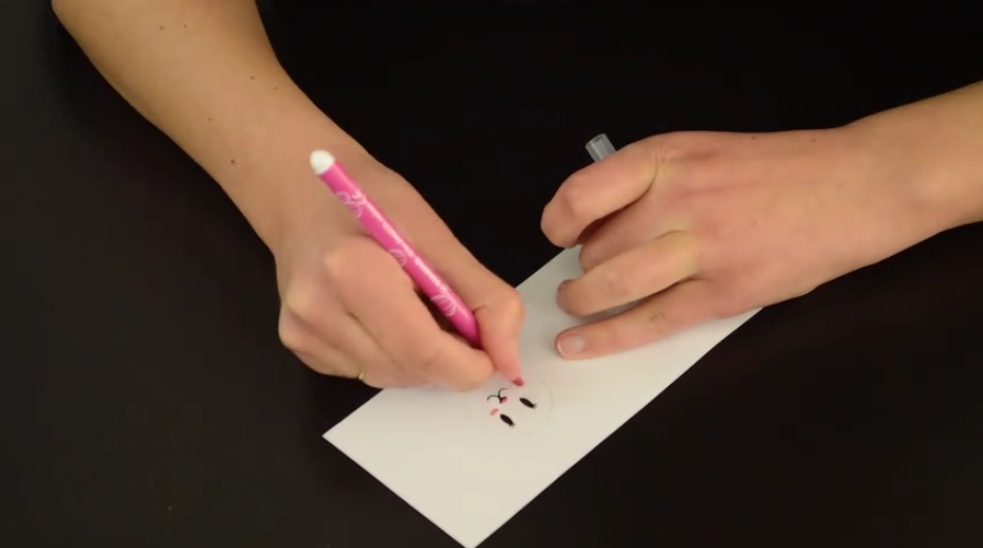 2/En attendant que la pince sèche, dessinez sur la feuille un cercle et à l’intérieur de ce même cercle, les yeux, le nez et la moustache d’un lapin au feutre noir. Vous pouvez également ajouter des détails au feutre rose.