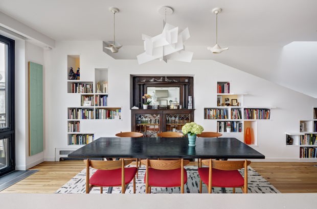 Cette magnifique résidence de charme possède en tout trois niveaux. Les professionnels ont alors pensé à confectionner un studio au dernier étage pour que l’artiste du couple puisse laisser aller sa créativité. Elle peut même profiter d’un petit balcon. Au rez-de-chaussée, on retrouve le salon, la fameuse bibliothèque, la salle à manger et la cuisine.